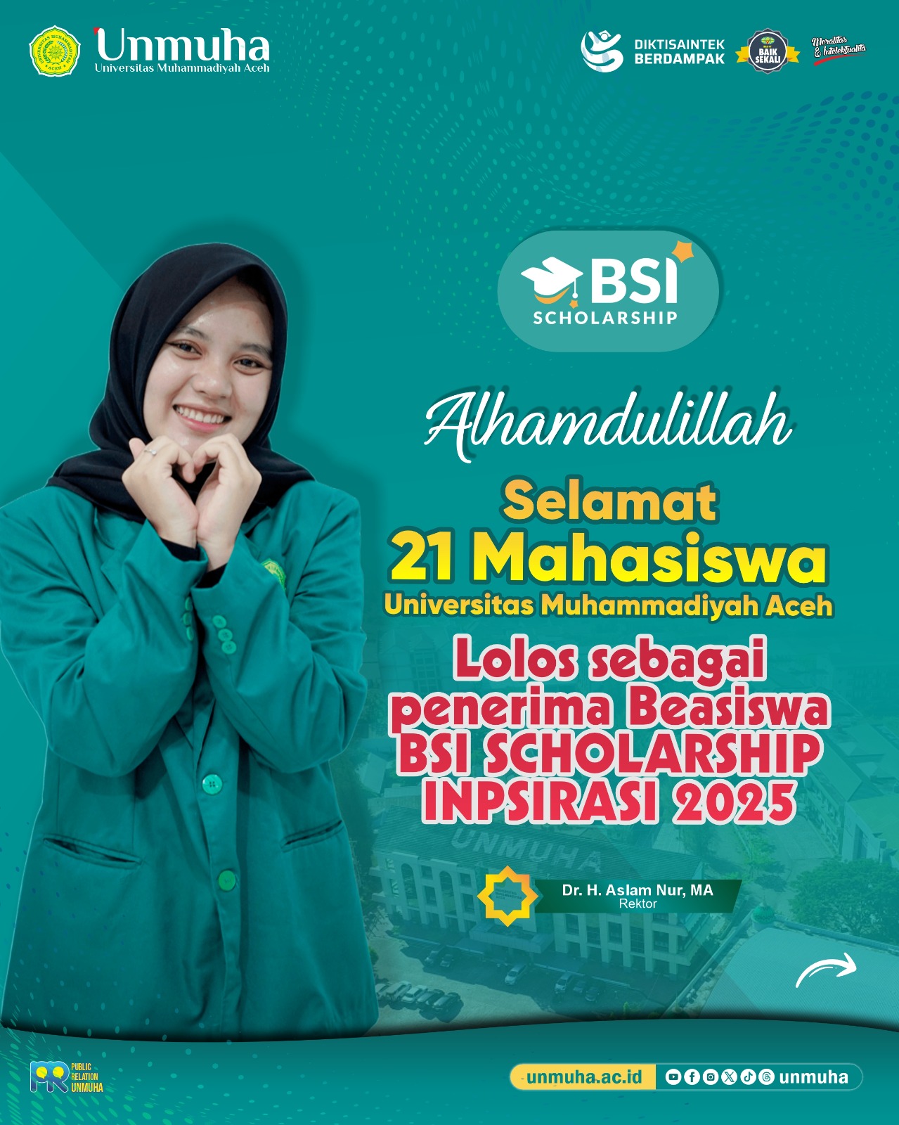 Tahun ini, sebanyak 21 mahasiswa Universitas Muhammadiyah Aceh (Unmuha) yang berasal dari 9 program studi di 3 fakultas berhasil lolos seleksi BSI Scholarship 2025, sebuah capaian yang membanggakan bagi civitas akademika Unmuha.