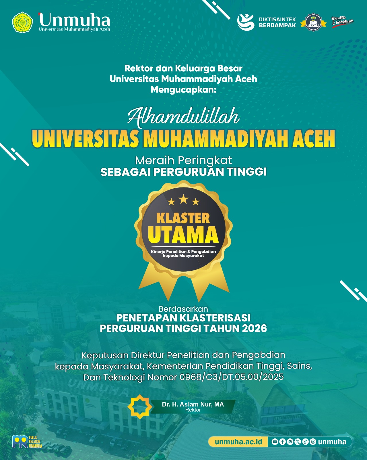 Universitas Muhammadiyah Aceh (Unmuha) mencatat capaian prestisius dengan ditetapkannya sebagai Perguruan Tinggi Klaster Utama dalam Kinerja Penelitian dan Pengabdian kepada Masyarakat (PPM) Tahun 2026.