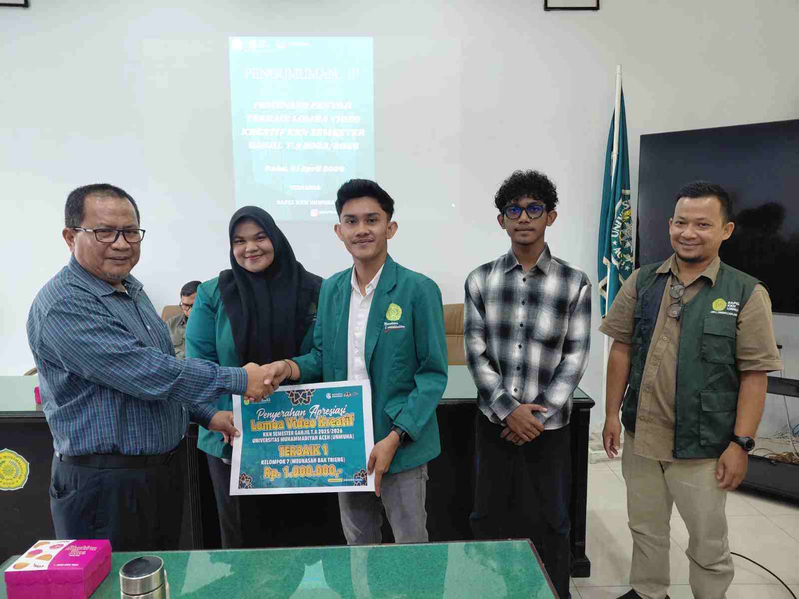 Rektor Universitas Muhammadiyah Aceh (Unmuha) memberikan apresiasi tinggi kepada para mahasiswa yang berhasil masuk dalam nominasi penyaji terbaik Lomba Video Kreatif Kuliah Kerja Nyata (KKN). Acara penghargaan untuk periode Semester Ganjil Tahun Akademik 2025/2026 ini berlangsung khidmat di Aula Rektorat Unmuha pada Rabu, 1 April 2026.