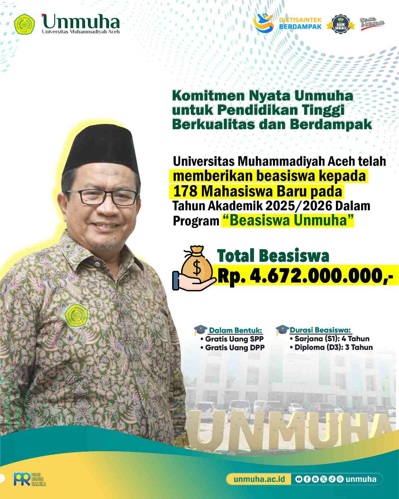 Universitas Muhammadiyah Aceh (Unmuha) kembali menegaskan komitmen nyatanya dalam meningkatkan akses pendidikan tinggi yang berkualitas di Aceh. Pada Tahun Akademik 2025/2026, Unmuha resmi menyalurkan bantuan pendidikan melalui program Beasiswa Unmuha kepada 178 mahasiswa baru yang terpilih.